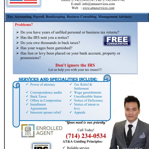 714-903-3000 - Learn more about IRS audit state audit and employment tax audit services from Accurate Accounting Tax Services Inc. We offer a wide range of income tax preparation tax problem resolution tax advisory and tax planning services geared for individuals and families small business owners and the self. Home Client Portal Contact Tax Organizer.